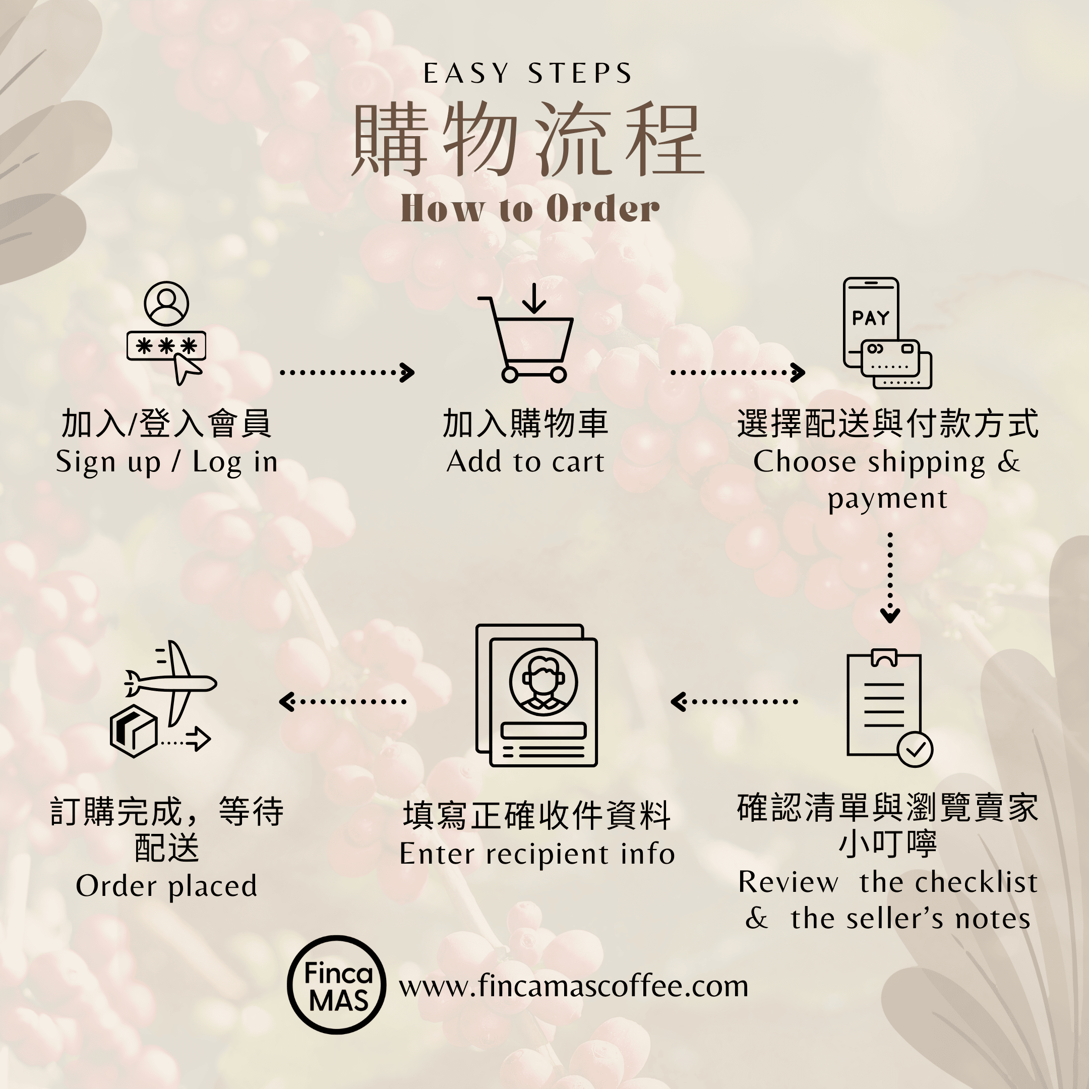 感謝您使用Finca MAS網路平台,當您選購商品後,結帳時請輸入您的資訊,我們將在收到訂單資訊後,盡快進行商品出貨服務。