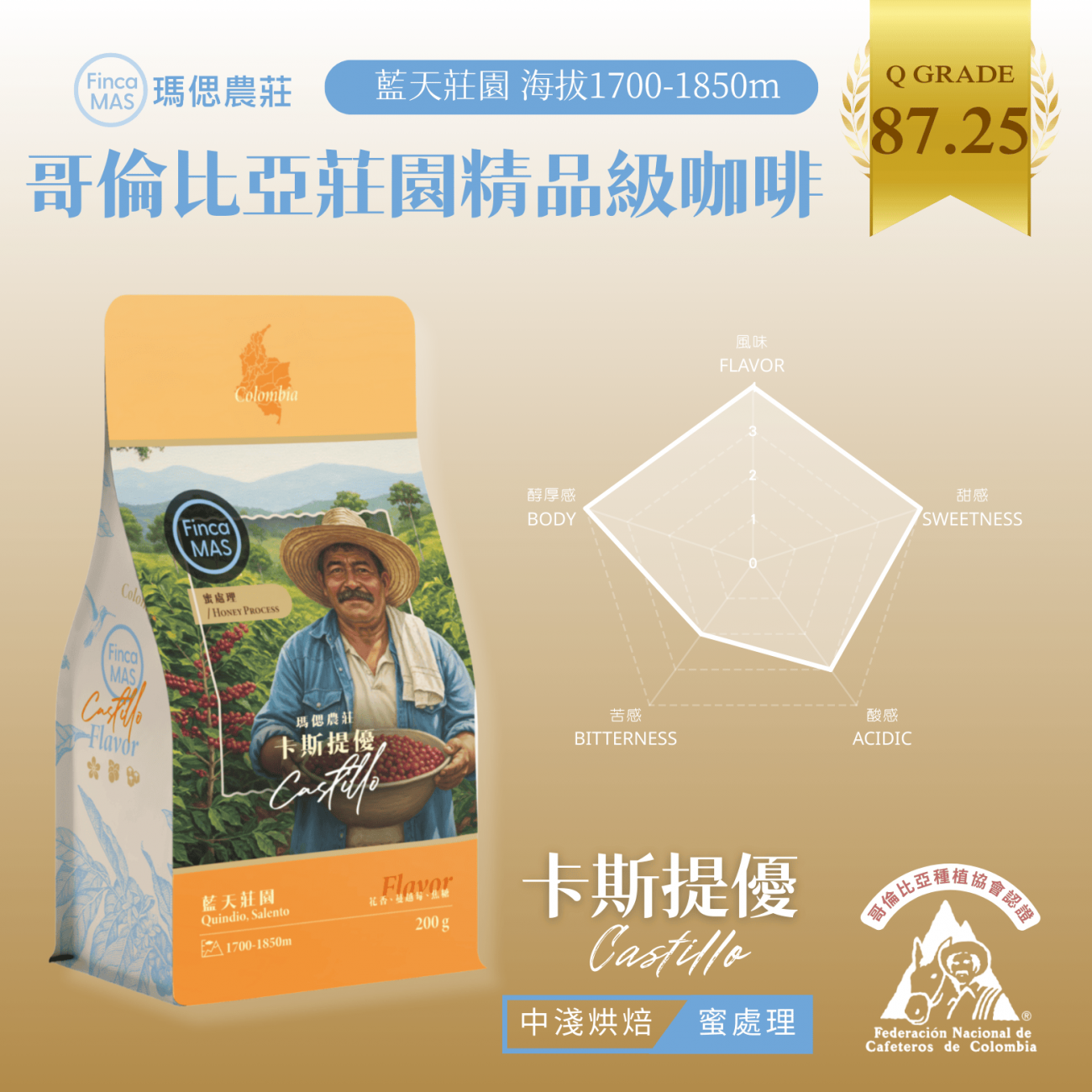 哥倫比亞 藍天莊園 卡斯提優 蜜處理 精品咖啡豆 200g